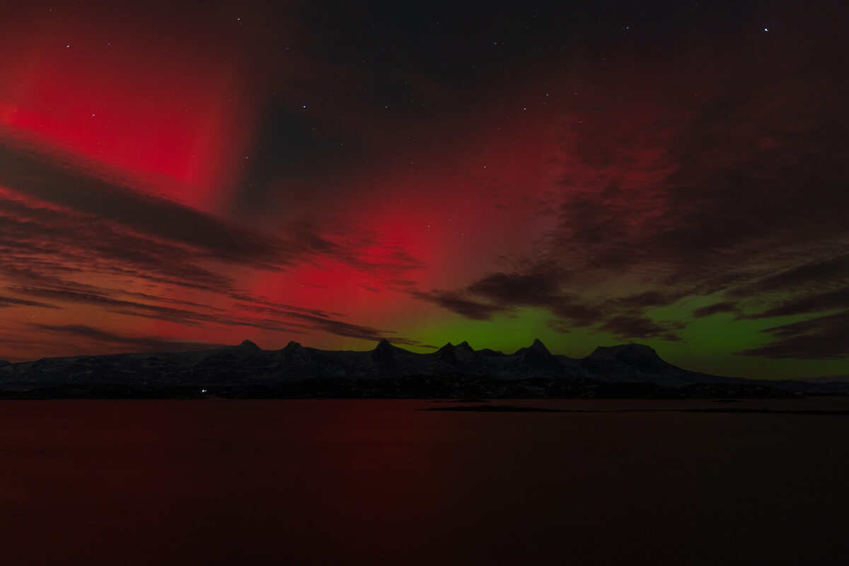 Dette bildet viser et nordlys med en uvanlig sterk rødfarge. Ofte kan det dukke opp svake røde toner i nordlysbildene uten at man legger merke til det der og da, men denne kvelden var annerledes , det røde var tydelig synlig med det blotte øye.